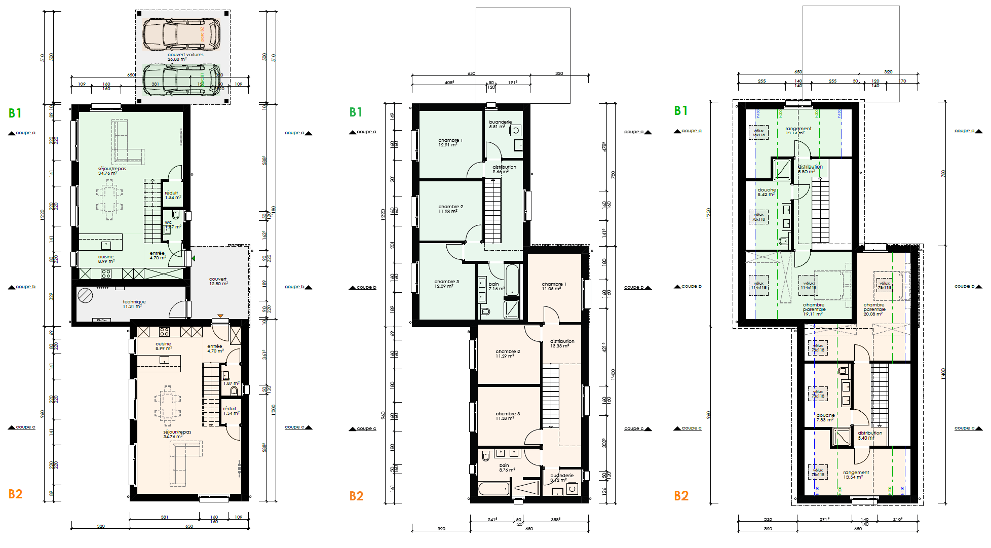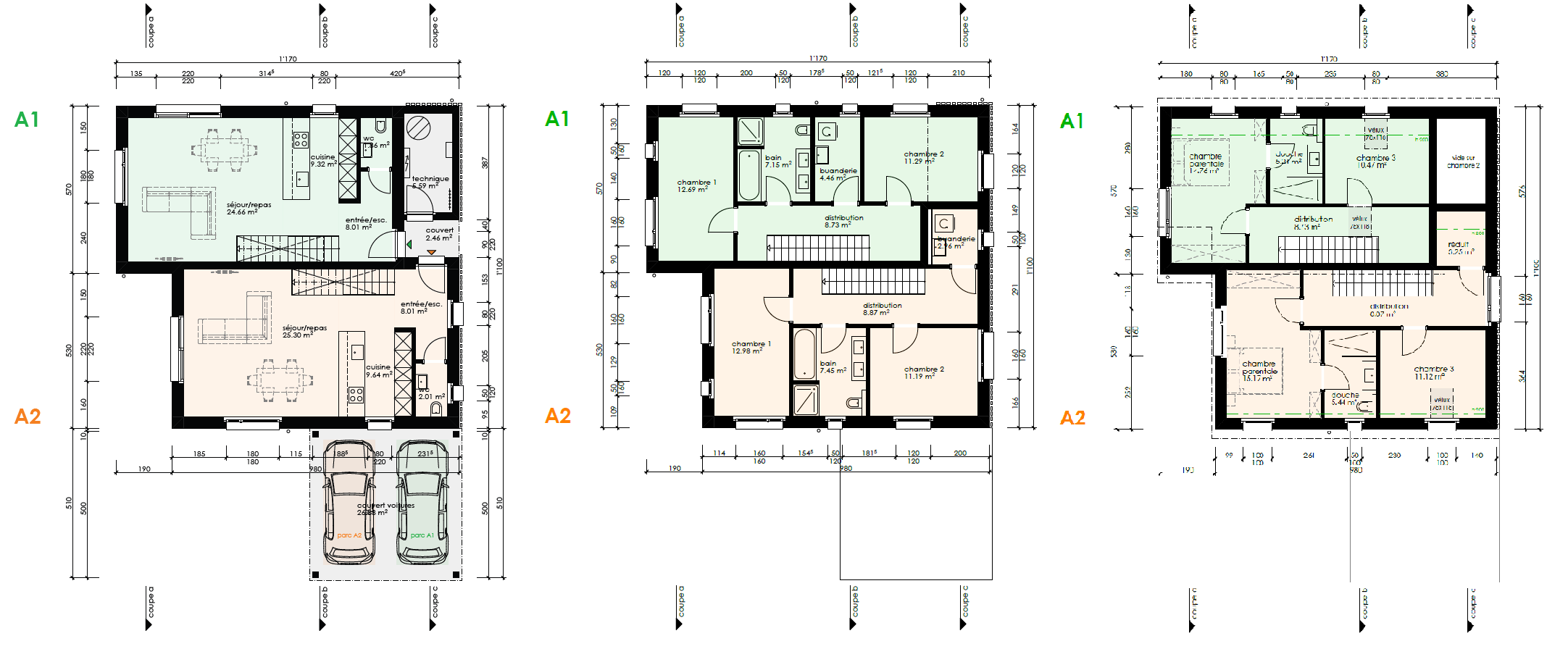 La chaleur est produite par une pompe à chaleur air-eau extérieure. Des panneaux solaires photovoltaïques sont installés sur chaque villa.